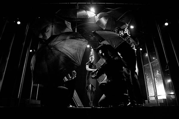 首先,這部戲第一個特點是圓形的舞台。中心圓形略微架高的舞台,搭配右側一個玻璃空間及左側階梯加上小小平台,使得整齣戲用非常態形狀舞台的方式製造出更多不一樣的效果。而這樣的舞台方式,也讓原先單調普通的鏡框式舞台多了幾分創新及神秘感。舉例來說,三位女主角出場介紹自己時,都會由側邊開始隨圓形繞,最後抵達中心,往前一步,開始介紹。於此時,兩旁的其他角色會隨著劇情的推進繞著圓弧轉,亦或是包圍著中間的主角。而且它有與觀眾親近及面對面的效果,就像是結合了中心式舞台的優點,卻能兼顧到較多面向。