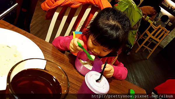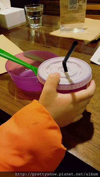 店家不僅送上兒童用的餐具,給的水還貼心的附上蓋子,噢,小甜蜜目前喝水力道還不太穩,