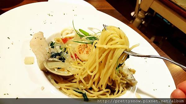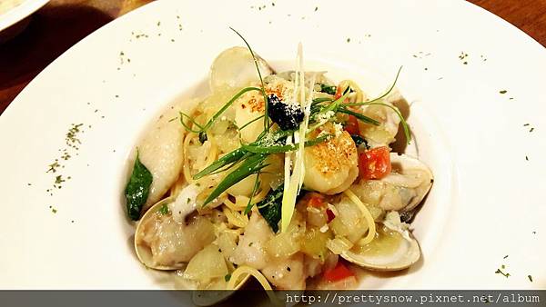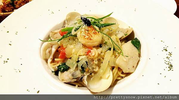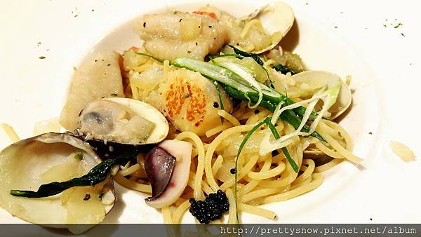 接著上主菜啦,這是碗桂點的香蔥魚子醬干貝海鮮義大利麵