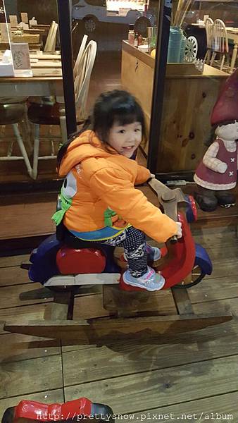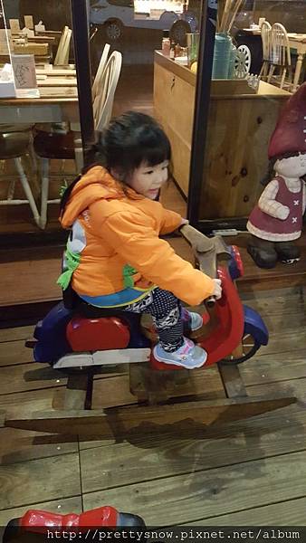 用餐完畢以後,小甜蜜居然騎上門口的搖搖木馬,不肯回家