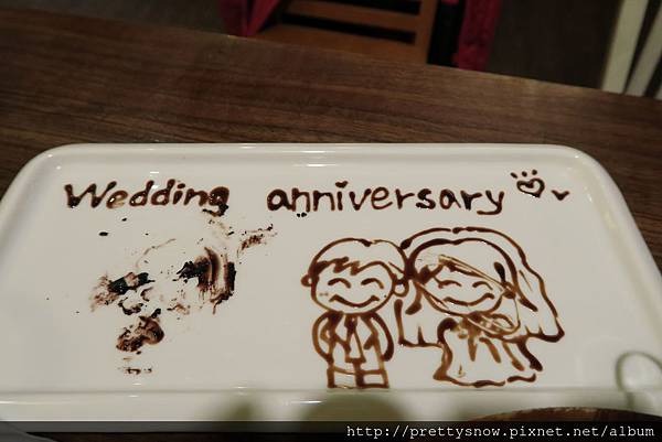 碗桂只是在點酒的時候說是慶祝結婚周年,他們就在盤子上寫上祝福的話和可愛的兩個人>///////<