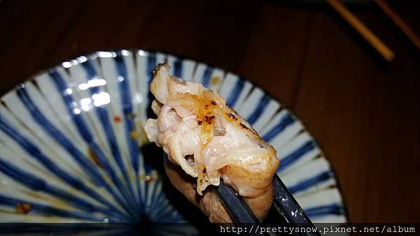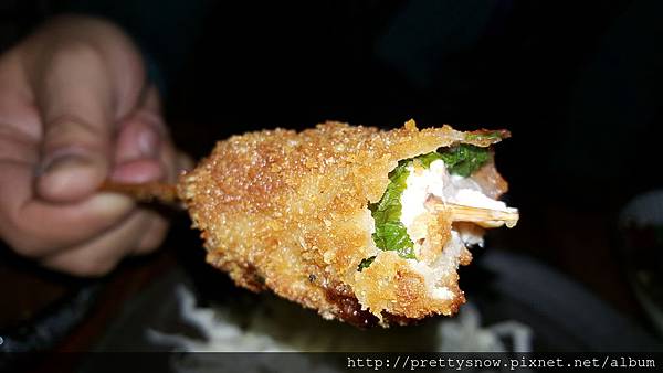 咬下去覺得香脆卻不油膩,麵衣很薄,滑嫩的雞腿伴隨著紫蘇特有的香氣,證明我們叫兩串是對的!