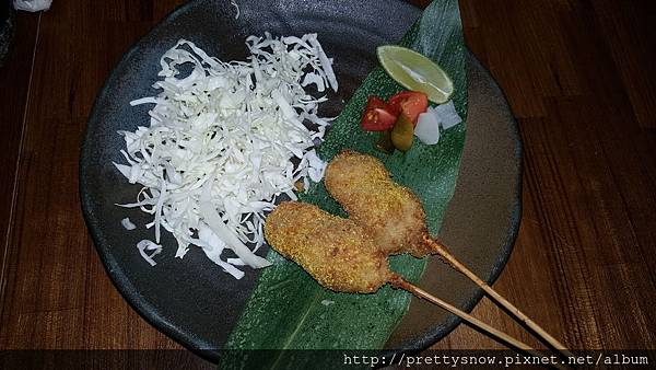最左邊是炸韓式泡菜$40/串 紫蘇雞腿$60/串 紫蘇雞腿店員很推薦所以我們叫了兩串。