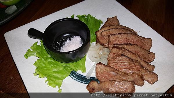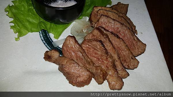 送上來時旁邊還附有海鹽,店員說是五分熟,會有點血水很正常。