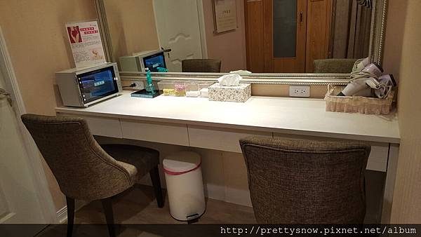 梳妝台很大,有化妝棉、棉花棒、髮夾、吹風機等。