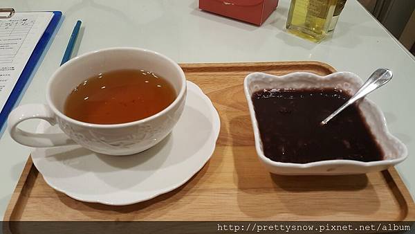 按摩完以後,招待員送上茶和紫米紅豆湯,哈,真剛好,碗桂在按摩一段時間後,